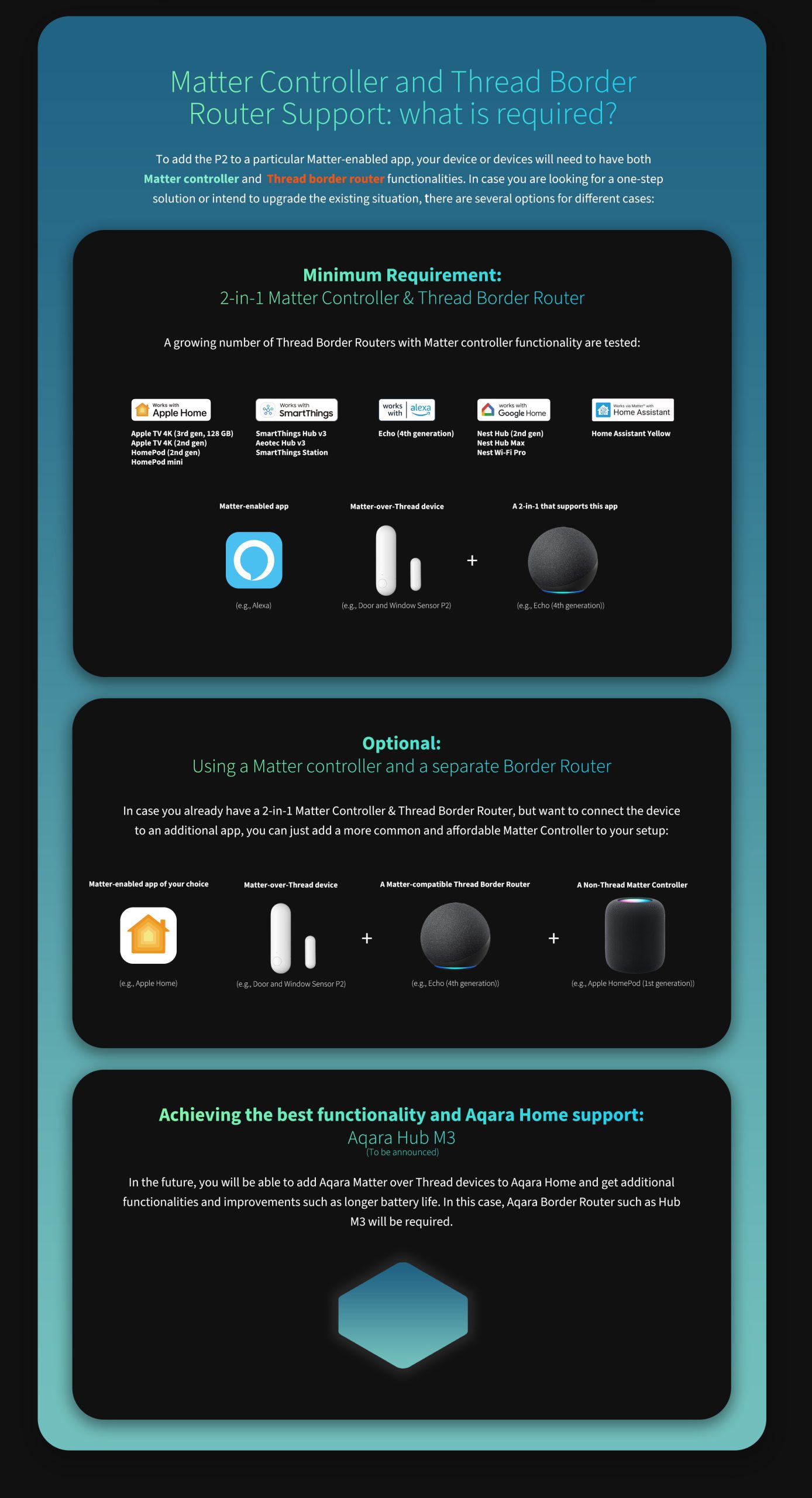 ** For at bruge Sensor P2 med et bestemt økosystem kræves en kompatibel Thread Border Router og/eller Matter-controller. ** Batterilevetiden kan variere afhængigt af hvilken border router og Matter-app sensoren er tilsluttet. For bedste resultat anbefales en Aqara border router. *** For at understøtte Matter over Thread-enheder i Aqara Home-appen kræves Hub M3. Aqara M3 Hub forventes lanceret snart.*