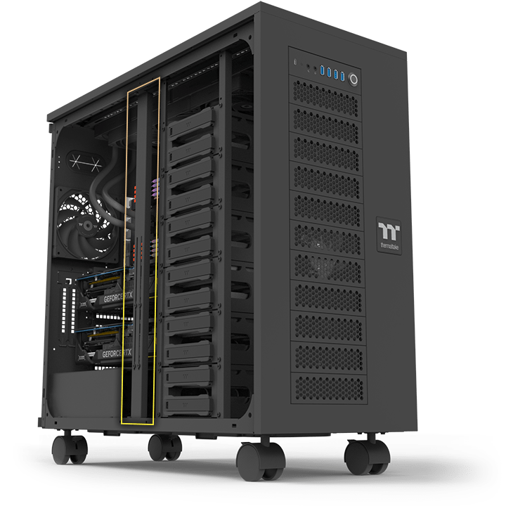 AX700 TG Super Tower Chassis, sammen med AX100 soklen, tilbyder flere konfigurationsmuligheder. Enheder kan stables ovenpå, nedenunder eller begge dele, hvilket skaber en yderst tilpasningsdygtig systemarkitektur. Denne modulære tilgang muliggør forbedrede væskekøleløsninger, udvidet lagerkapacitet eller dual-system konfigurationer, hvilket giver enestående udvidelsesmuligheder for professionelle brugere.