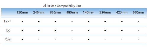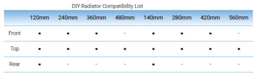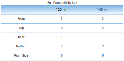 Kølesystem Nederst: blæserstativ / 2 x 120/140 mm blæser understøttet, Top: blæserstativ / 4 x 120/140 mm blæser eller 360/420/480/560 mm radiator understøttet, Bagside: blæserstativ / 1 x 120/140 mm fan eller 120/140 mm radiator understøttet, Front: blæserstativ / 3 x 120/140 mm blæser eller 360/420 mm radiator understøttet, Højre side: blæserstativ / 8 x 120/140 mm blæser understøttet
