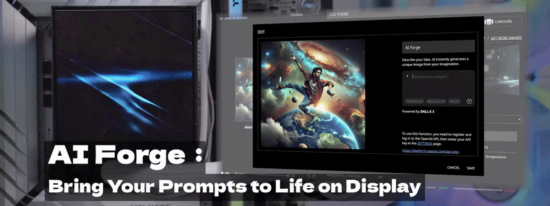 AI Forge, integreret i TT RGB PLUS 3.0-softwaren, løfter tilpasningsmulighederne for LCD-skærmen. Brugere kan generere sofistikerede baggrunde via simple tekstprompter, hvor AI'en straks producerer visuelt indhold, der afspejler deres specifikationer. Softwaren tillader direkte lagring af disse kreationer uden yderligere behandlingsskridt, understøtter omfattende designredigering, muliggør systeminformations-overlay og giver fuld personliggørelse.