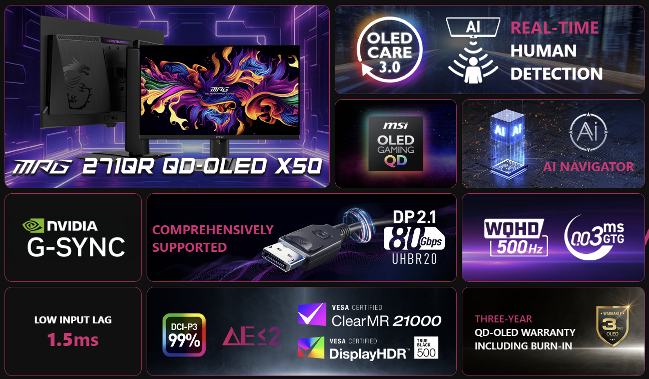 Oplev immersiv gaming med MPG 271QR QD-OLED X50. Med et 2560 x 1440 (WQHD) QD-OLED-panel, 500 Hz opdateringshastighed og 0,03 ms (GtG) responstid leverer den skarp klarhed og hastighed. VESA ClearMR 21000 og DisplayHDR True Black 500 sikrer levende billeder med dybe sorte nuancer og minimal bevægelsessløring. MSI’s AI Care Sensor registrerer brugerens tilstedeværelse og aktiverer OLED-beskyttelse, når skærmen er inaktiv. Sammen med OLED Care 3.0 hjælper den med at forebygge burn-in og forlænge panelets levetid. Til konsolbrugere understøtter HDMI™ 2.1 4K 120 Hz, VRR og ALLM. Den nyeste DisplayPort 2.1a tilbyder 80 Gbps båndbredde til next-gen gaming og professionel brug.