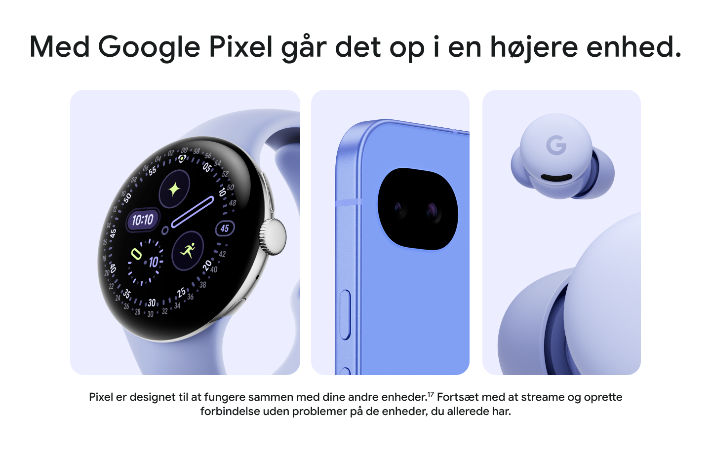 1 Ved at oprette et abonnement accepterer du vilkårene for Google One, som kan ses på one.google.com/terms-of-service, og for tilbud på one.google.com/offer/freetrial. Se, hvordan Google håndterer data, på www.google.com/policies/privacy. 2 Ved køb af kvalificeret enhed. Tilbuddet er kun tilgængeligt for nye brugere af Google One. Indløs tilbuddet senest den 31. marts 2027 kl. 23.59 CET. Du skal angive en gyldig betalingsform ved tilmeldingen, men du bliver ikke opkrævet, før prøveperioden udløber. Medmindre du opsiger abonnementet tidligere, opkræver Google One 17 kr. efter prøveperiodens udløb, hvilket faktureres på fast månedlig basis. Opsig når som helst inden overgangen til et betalt abonnement (og herefter til udgangen af den aktuelle faktureringsperiode). Ingen refusion for delvise faktureringsperioder, medmindre det er påkrævet i henhold til gældende lovgivning. Returnering af en købt enhed kan medføre opsigelse af abonnementet. Se g.co/pixel/google-one-3-month-offer for at få flere oplysninger.