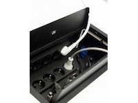 Cable Support Conference leveres med 8 stikkontakter (4 + 4) og 5 m tilførselskabel. 14 færdige kabelspor med kabellås gør det muligt at tilføre forskellige typer kabler som f.eks. patchkabler, HDMI, USB-A, USB-C eller andre ønskede kabler. Med denne løsning kan brugerne nemt tilføre kabler selv, samtidig med at kabellåsen sikrer og sorterer kablerne. Produktet kan også seriekobles (strøm) ved større installationer. Alt dette gør, at produktet hele tiden er klargjort til nye kabler og på den måde forny sig efter ændrede behov. Overskydende kabler samles op i kabelpose under.