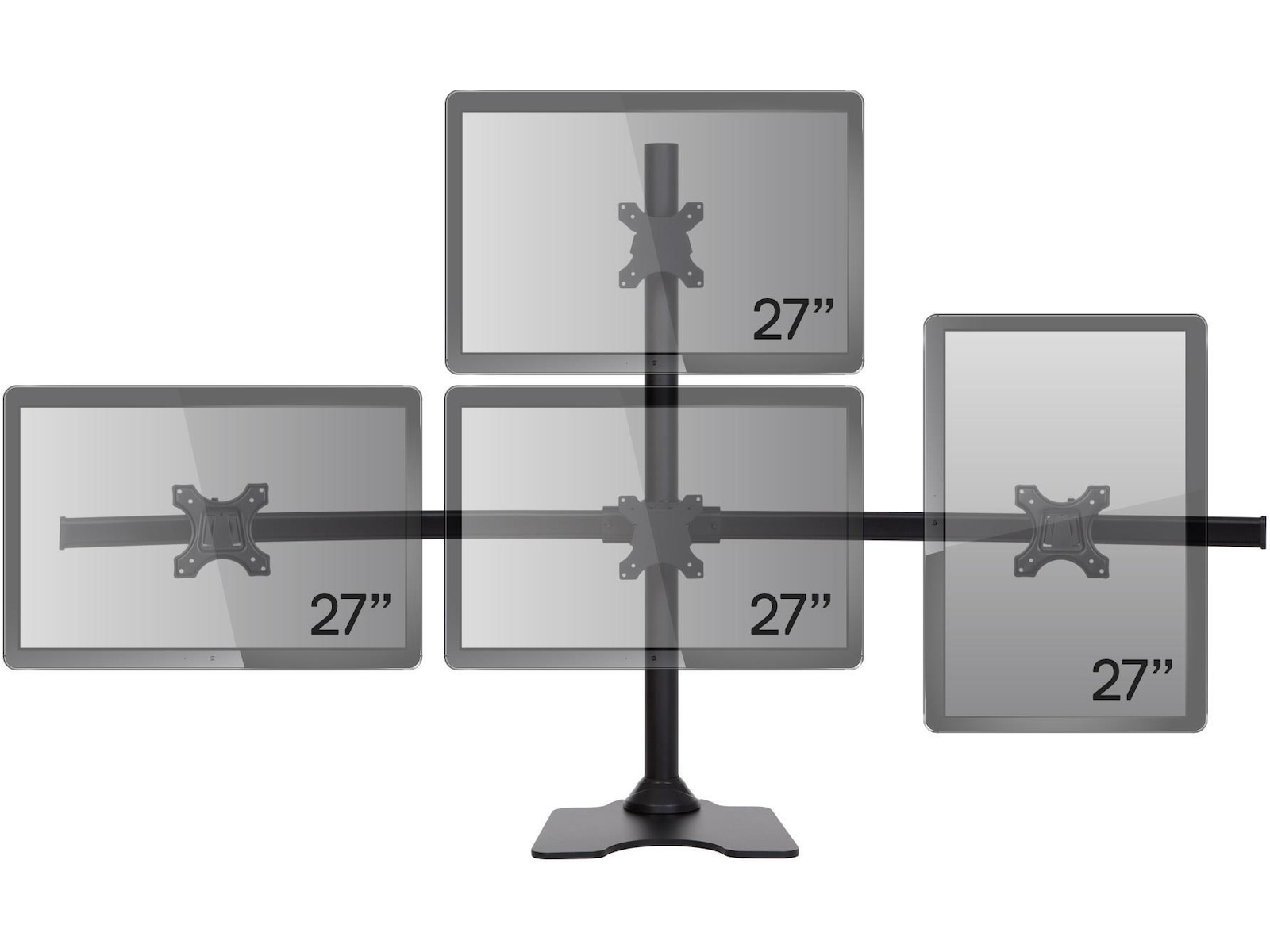 Dette skærmstativ leveres med drejelig 75/100 mm VESA-plade. Det giver dig mulighed for at indstille dine skærme i enten liggende (vandret) eller stående visning (lodret).