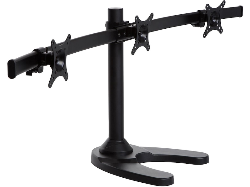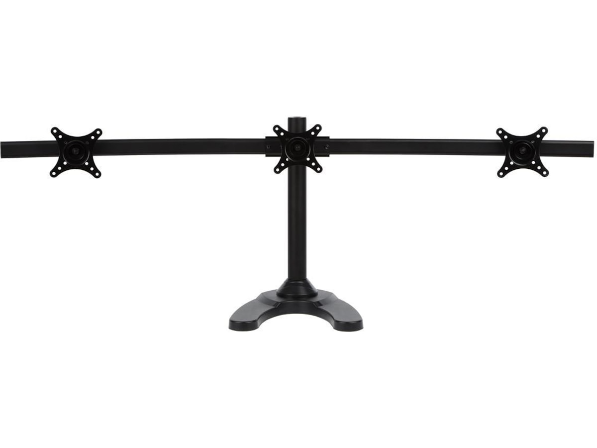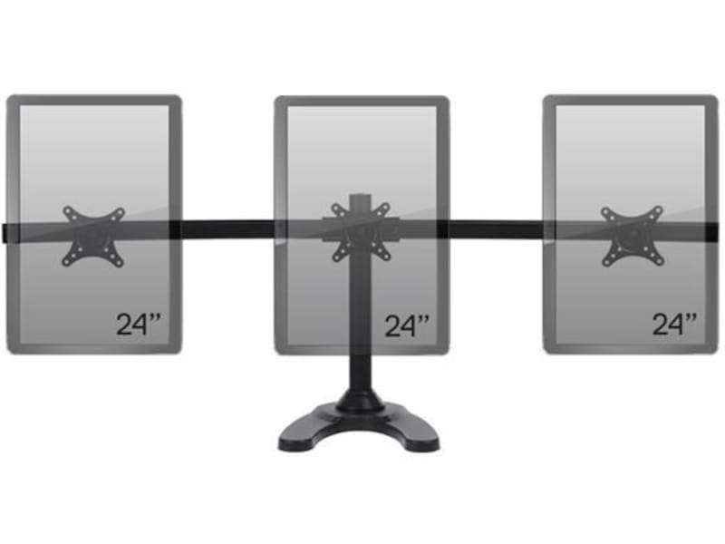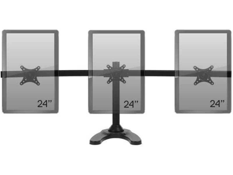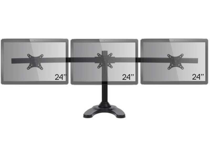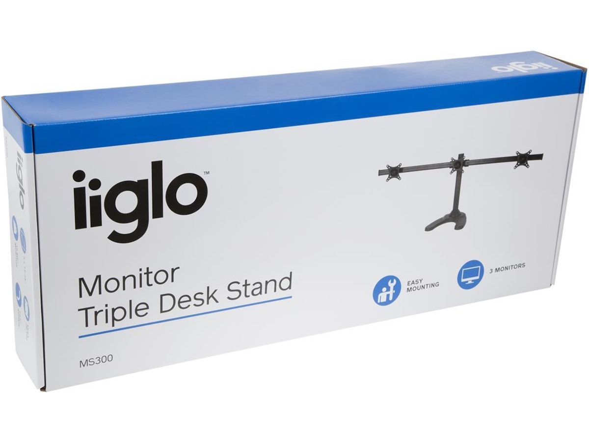 iiglo Triple Monitor Stand giver dig mulighed for at opsætte tre skærme sammen på dit skrivebord. Skærmene kan vinkles, roteres og vippes individuelt. Skærmenes højde er også justerbar. Beslaget kan indstilles som fritstående med et stabilt stativ eller kan til ekstra sikkerhed skrues fast på dit skrivebord. Det leveres med en 75/100 mm VESA-plader, der muliggør en nem installation af de fleste 13-24” skærme.