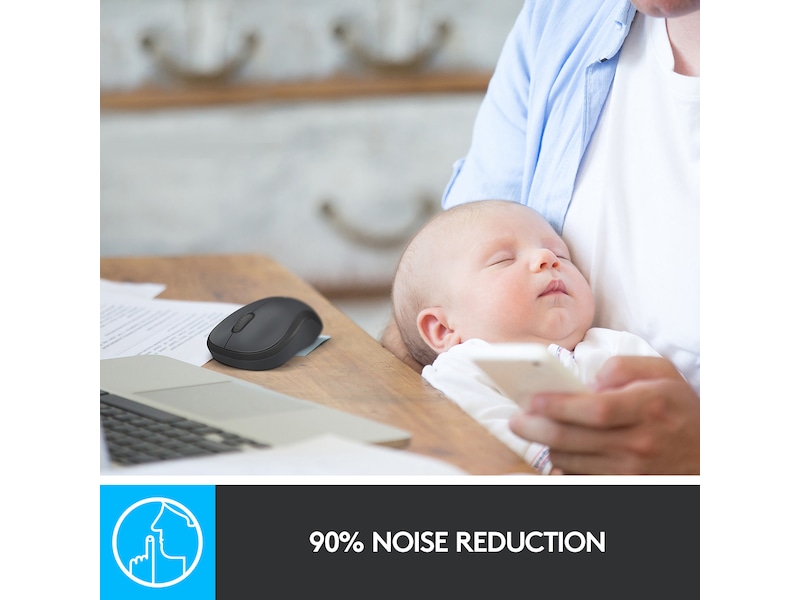 Nyd lyden af stilhed. Med det samme klik kan du mærke en støjreducering på mere end 90 %* af kliklyden, så du og dine omgivelser kan nyde lyden af stilhed. *Lydniveau sammenlignet med Logitech M170. Målt af et uafhængigt laboratorium og verificeret af Quiet Mark™.