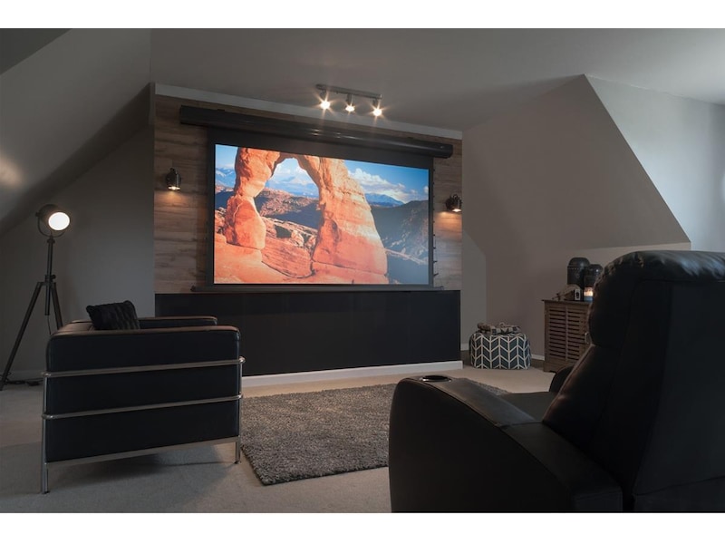 Elite ProAV’s Saker Tab-Tension CineGrey 5D® is 1.5 gain ambient and ceiling light rejecting® (CLR®) projector screen that comes in Elite’s Saker electric “roll-up” configuration. ALR and CLR® projection screens enhance picture quality with brighter imagery and more defined contrast levels. However, its greatest value comes from its ability to counter the “wash out” effect of ambient light. The material is also ISF certified for its ability to achieve D65 color neutrality, superb contrast and dynamic range bringing a world class performance to any installation.