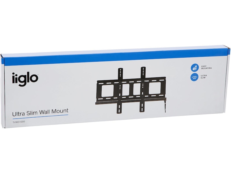 iiglo TVWS1000 er et ultratyndt vægbeslag designet til 32'' til 65'' fladskærme. Det er lavet i sortlakeret stål og tåler en maksimal vægt på 45kg. Beslaget understøtter universel VESA-standard op til 600x400, og kan monteres på TVer med buet og flad bagside.