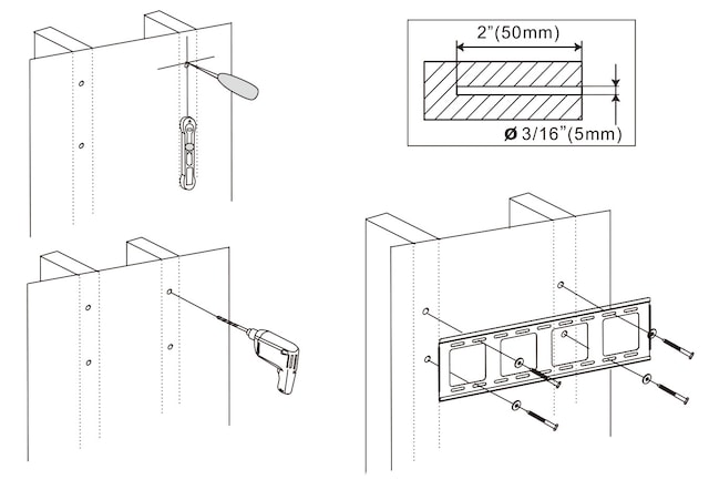 - Vægskinnen (65cm lang) fastgøres til væggen. Fastgør det medfølgende vaterpas til vægskinnen for lige montering i vater. BEMÆRK: Sørg for at montere i stolper/lægter i gips og træ. Brug de medfølgende plugs ved montering i mur.