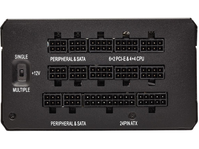 Skift mellem individuel +12 V-skinne eller multi +12V skinnetilstand. I positionen “SINGLE” er den fulde udgangskapacitet af strømforsyningens +12V- skinne tilgængelig for ethvert stik, og i positionen “MULTIPLE” har hvert individuelt stik overstrømsbeskyttelse, så der højst kan leveres 40A strøm til et givent kabel.