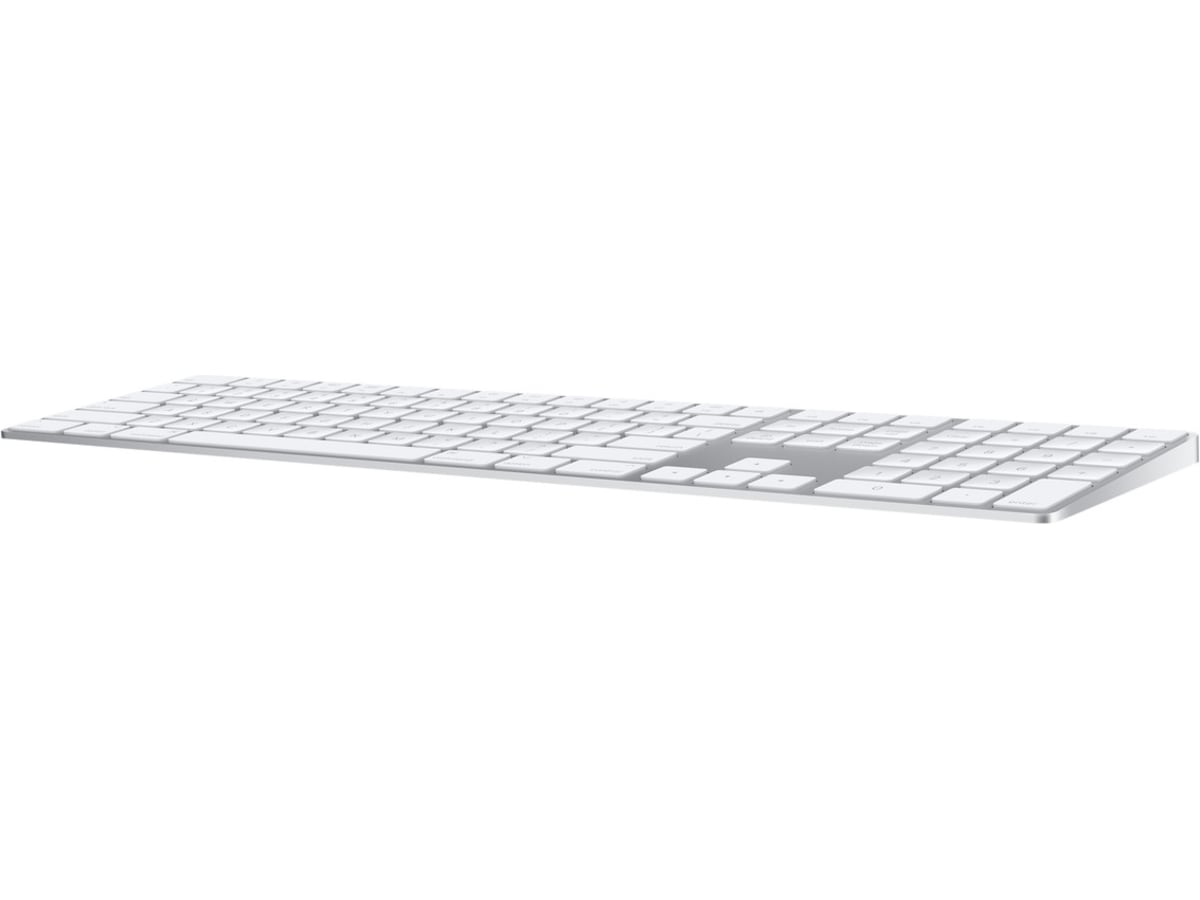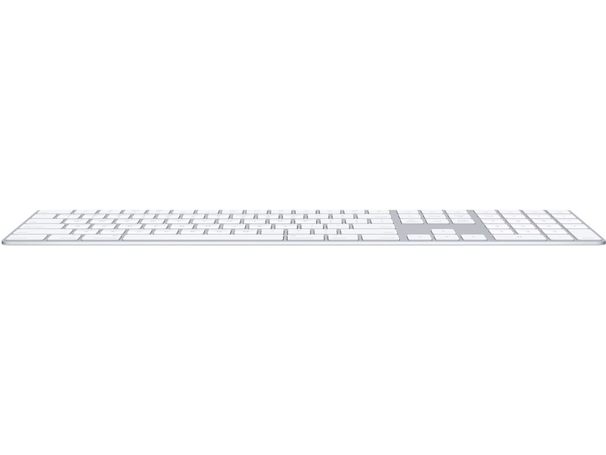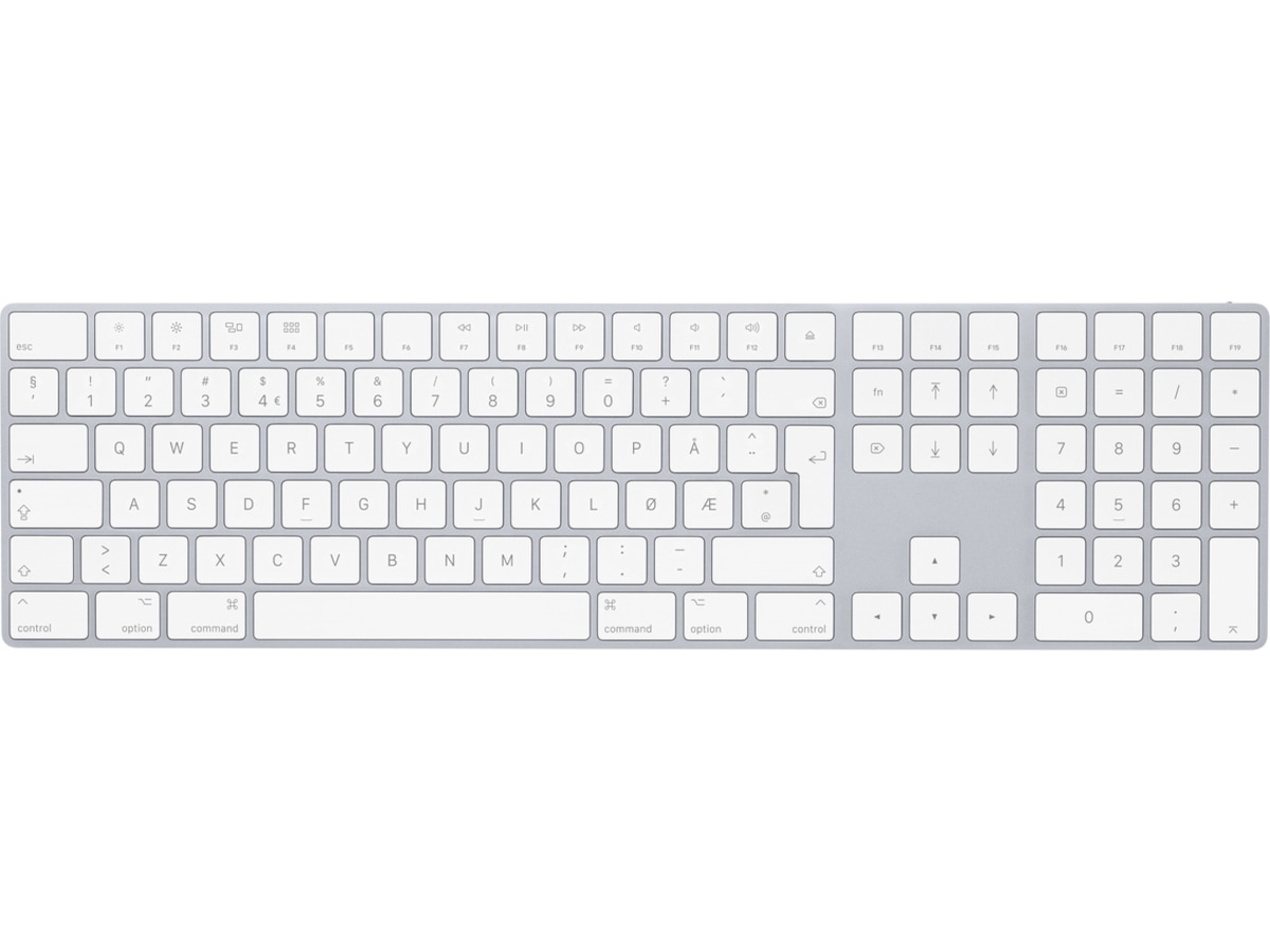 Magic Keyboard med numeriske taster har et udvidet layout med navigationsknapper til hurtig scrolling i dokumenter – og piletaster i fuld størrelse til gaming. En fjedermekanisme under hver tast øger stabiliteten, mens det optimerede tastetryk og tastaturets lave profil giver en usædvanlig behagelig og præcis skriveoplevelse. De numeriske taster er også gode at have, hvis du arbejder i regneark og økonomiprogrammer. Og det indbyggede genopladelige batteri holder utroligt længe og giver tastaturet strøm nok til ca. en måned eller mere, inden du skal lade det op igen.