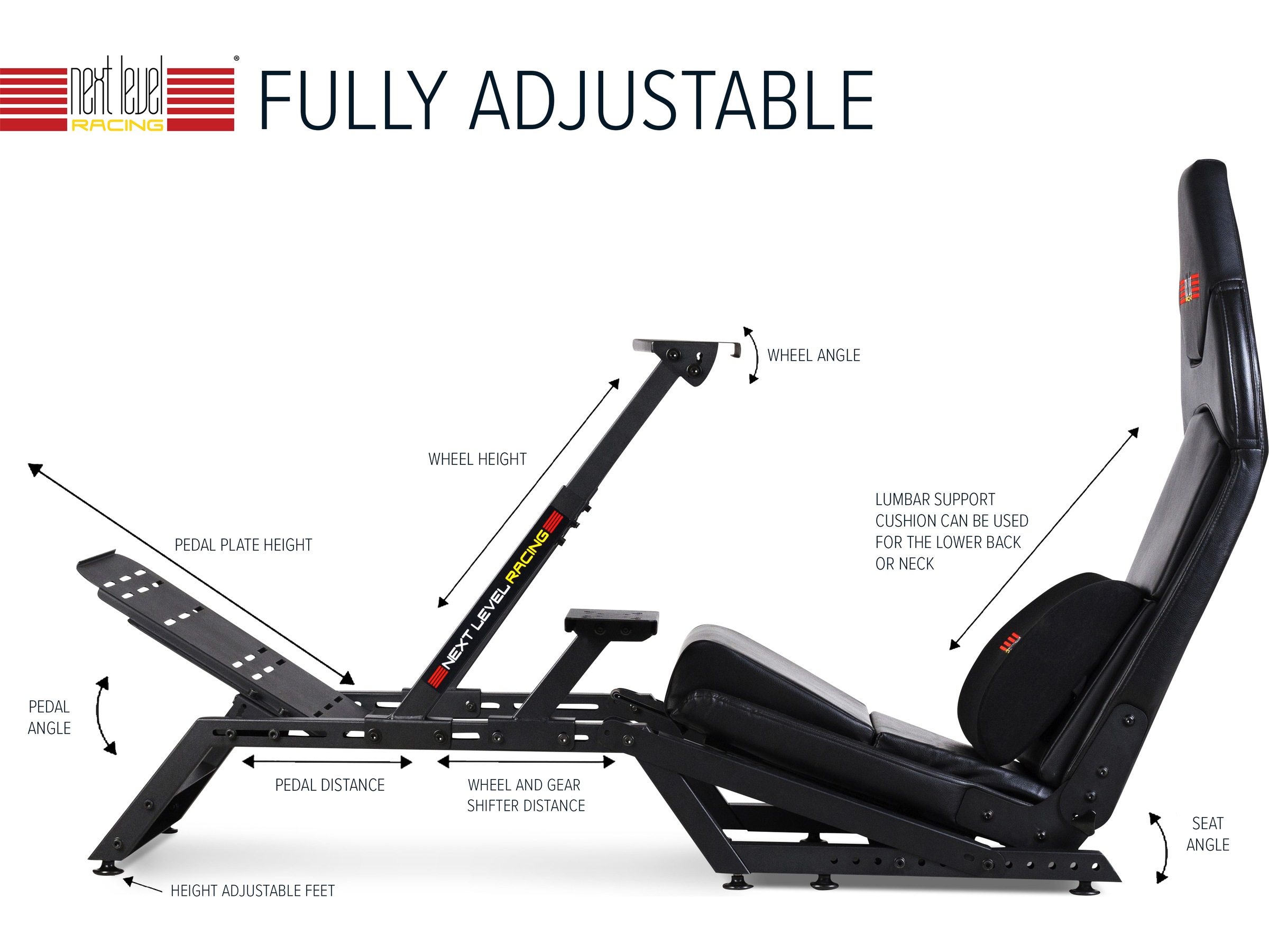 Det patenterede design af Next Level Racing® F-GT sikrer et stift og solid cockpit, men også mange justeringsmuligheder, hvilket betyder, at du har dit rat, pedaler og gearstang i den bedste position, der passer til dig som kører. Rat-støtten er solid nok til professionelle, direkte kørerat, og den stive konstruktion af pedalpladen sikrer, at du får en solid racing-oplevelse.