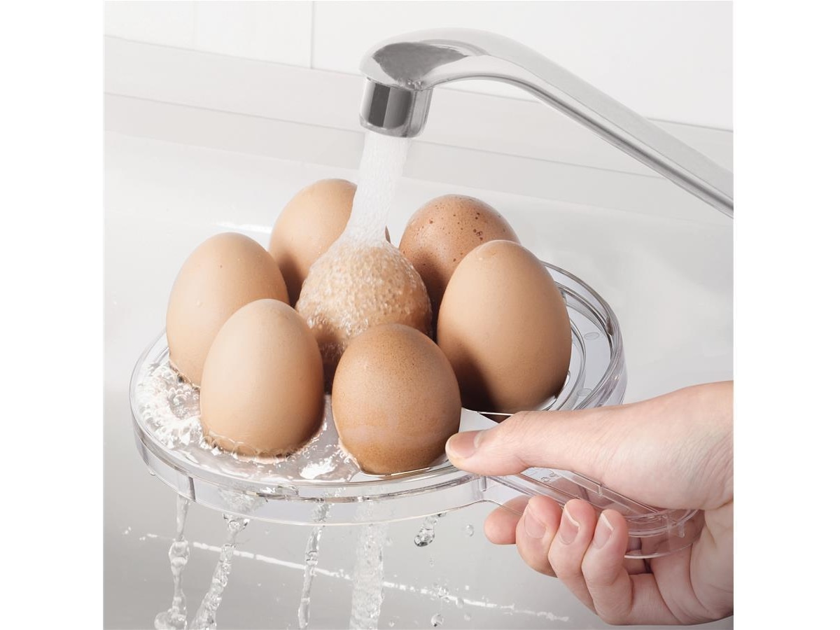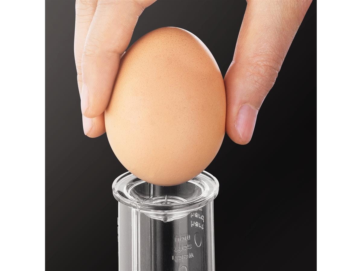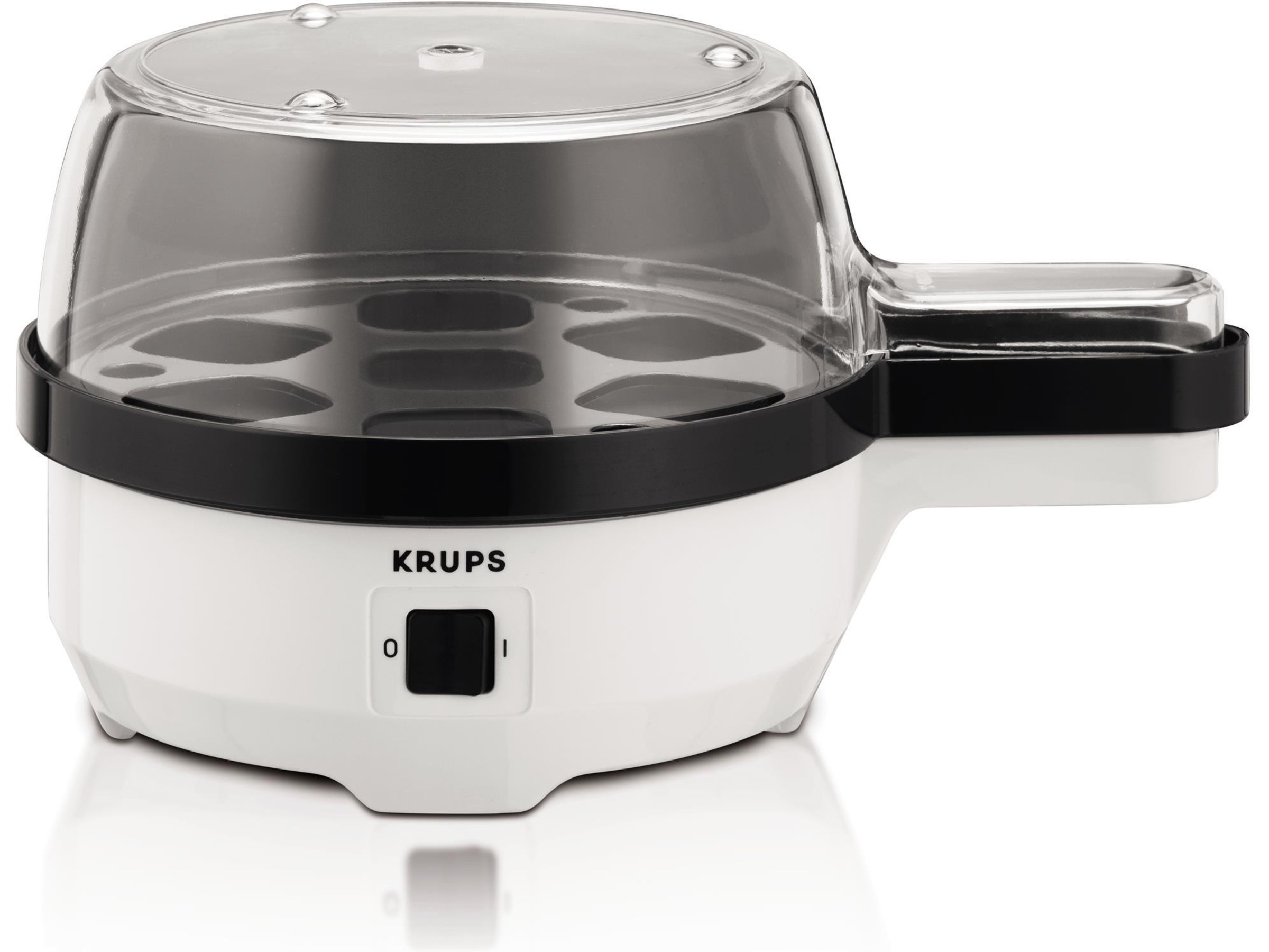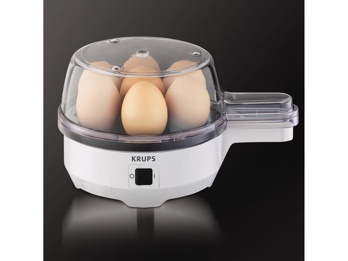 KRUPS æggekoger koger fra 1 til 7 æg ad gangen. Prik æggene, put dem i kogeren og hæld vand på. Mængden af vand er afgørende for, om du vil have ægget blødkogt eller hårdkogt. Tænd for kontakten og vent på bip, der indikerer, at æggene er kogt færdigt. Målebæger med integreret hulstikker leveres med.