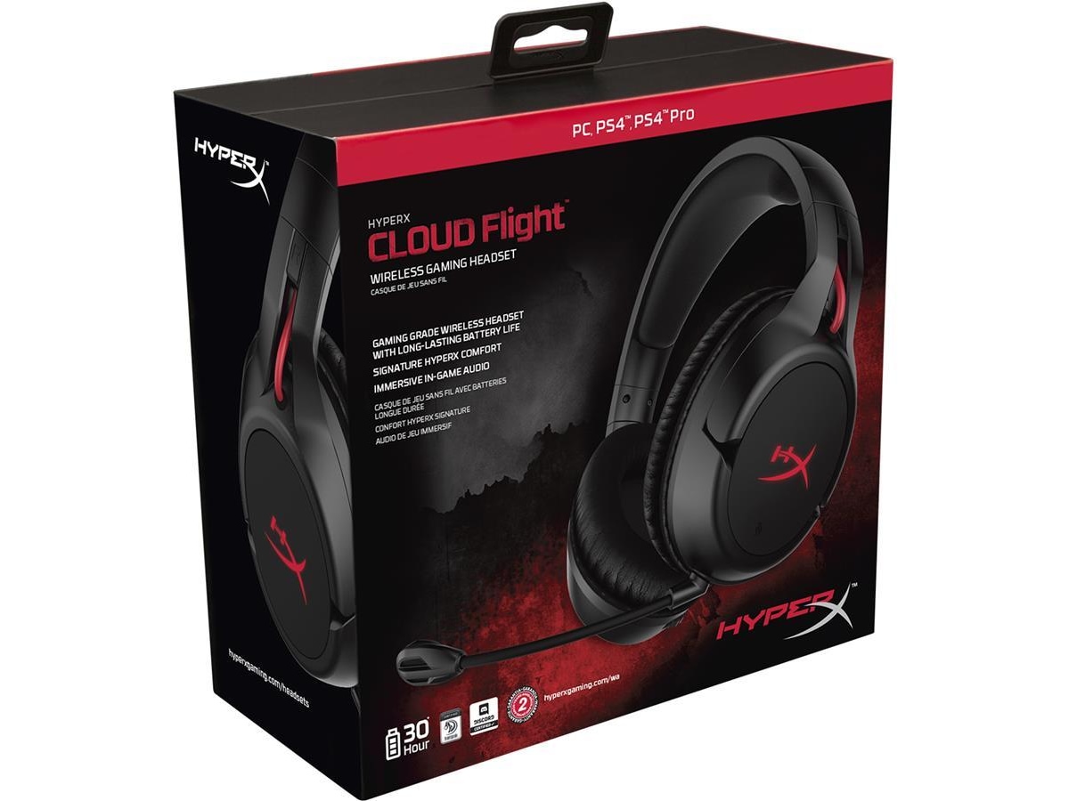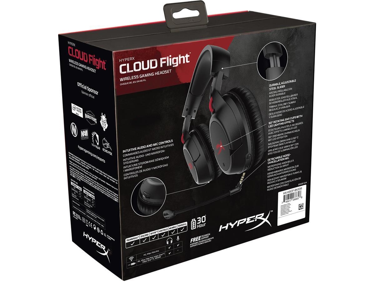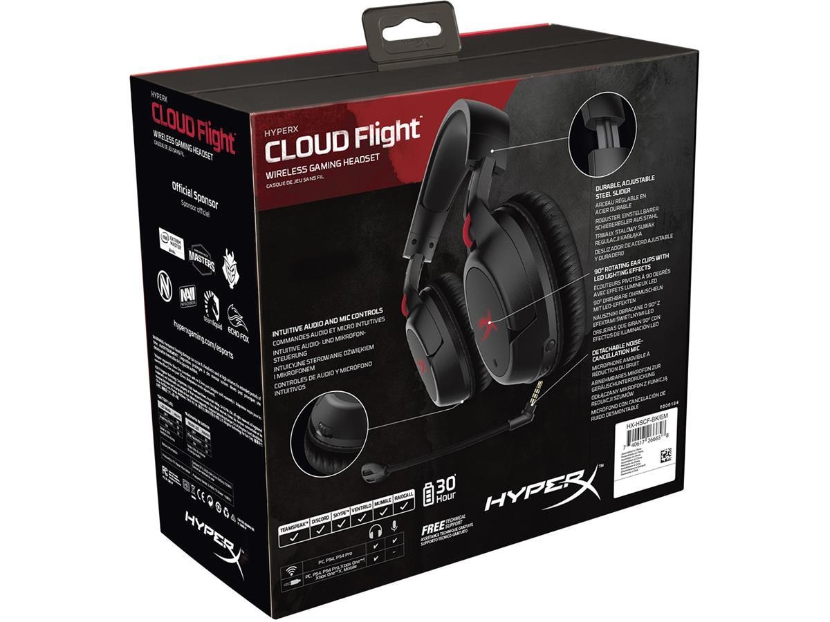 Undgå begrænsningerne af kabelforbindelser, og vær fri med de trådløse HyperX Cloud Flight™. Med en solid gaming-klasse trådløs forbindelse, utrolig 30-timers batterilevetid og Signature HyperX Comfort, giver Cloud Flight dig mulighed for at spille uafbrudt i længere tid. Det lukkede kop design hjælper med at holde dig nedsænket i spillet, mens den holdbare stål skydekontrol og højkvalitets konstruktion sikrer at den kan modstå daglig slitage. Dette PC, PS4™ og PS4™ Pro klar headset er også hovedtelefon-kompatibel med enheder, der understøtter et 3,5mm kablet lydforbindelse via det medfølgende kabel. Ørekopperne kan roteres 90° for at sidde behageligt rundt om halsen under pauser, og har bekvemme kontrol for LED-effekter, mikrofon-mute, tænd og volumen. Den aftagelige støjreducerende mikrofon hjælper med at sikre, at din kommunikation bliver hørt krystalklart, og Cloud Flight er certificeret af TeamSpeak og Discord.